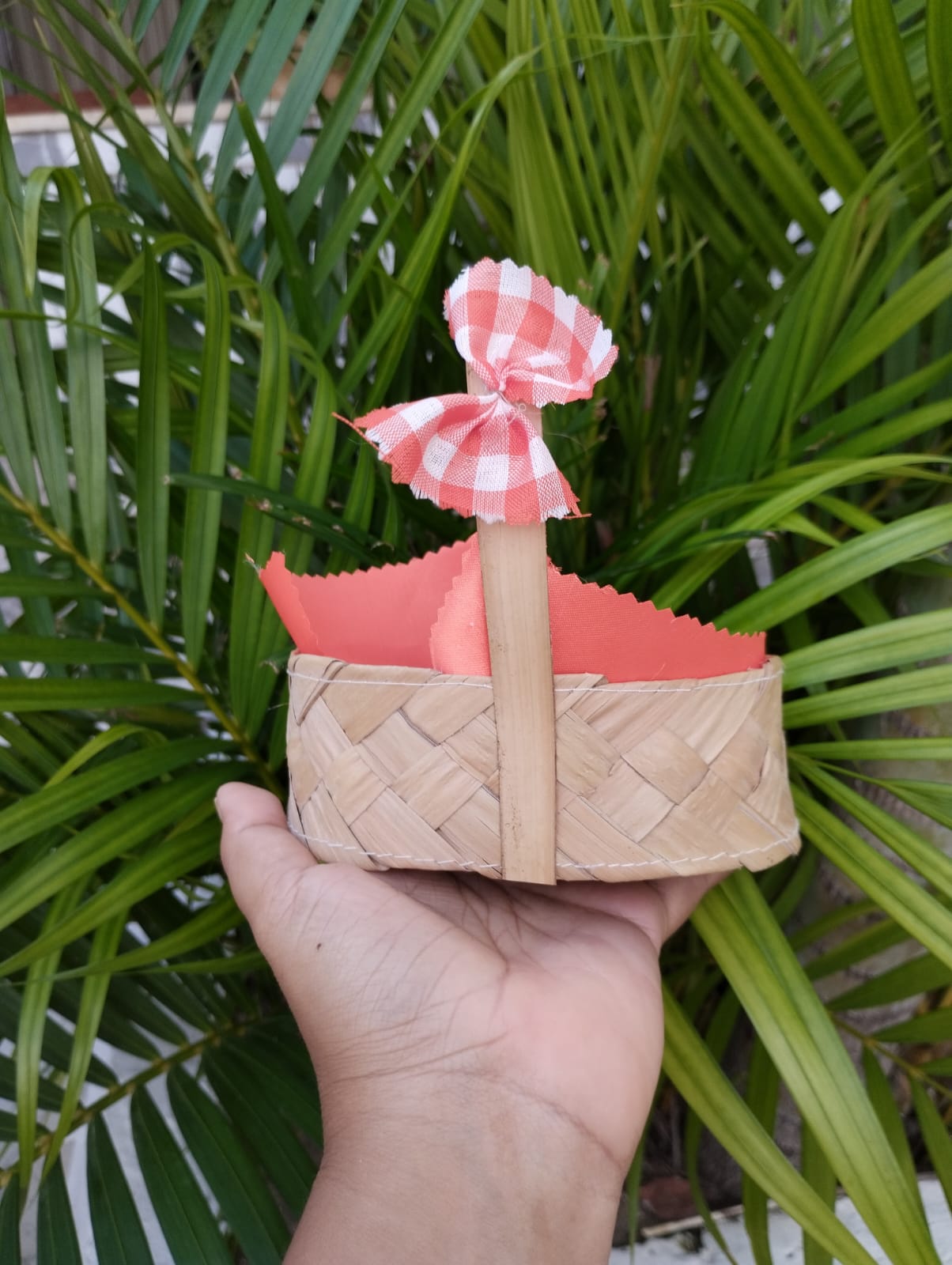 Lote com 50 cestinhas, feita com palha de carnaúba fundo de papelão revestido com tecido internamente.